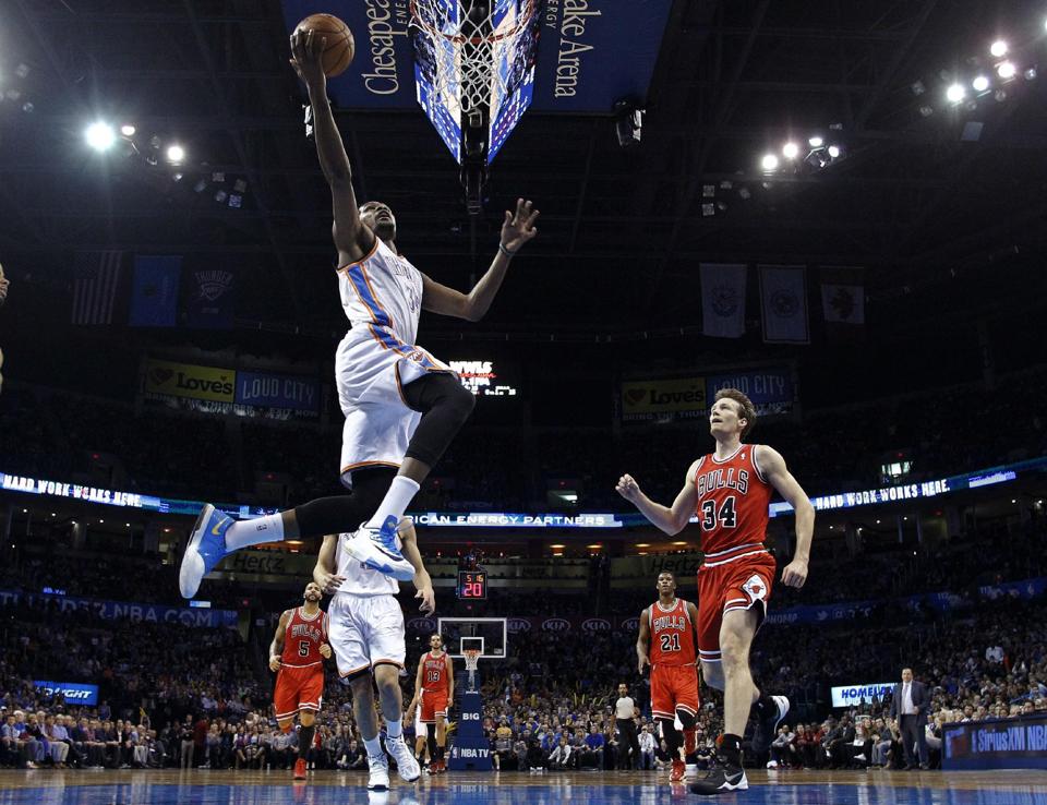 Cette 13e victoire de suite à domicile (record de franchise égalée), le Thunder l’a d’abord construite dans le premier quart temps avant de la consolider dans le troisième quart. Menant rapidement de 14 pts rapidement, le finaliste 2012 a remis un coup de cravache au retour des vestiaires. Grâce notamment à deux tirs primés de Mike Dunleavy, Chicago était revenu à -3 à la pause, il fallait renvoyer un message illico. Westbrook et Durant s’en sont chargés dans le troisième quart pour infliger un 13-4 à des Taureaux, abattus mais pas encore à terre malgré 15 pts de débours.