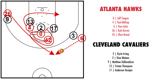 Chez les Hawks, on a également utilisé cette technique pour forcer une deuxième prolongation face à Cleveland. Pero Antic fait la remise en jeu et tout le monde s’attend à ce que Kyle Korver reçoive le ballon.