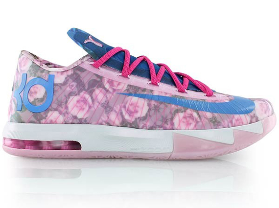 Après les animaux, la KD VI se met aux plantes. Pour rendre hommage à la tante “Pearl” de Kevin Durant, Nike a créé ce coloris couvert de roses. Original, mais probablement difficile à porter en match pour la star du Thunder. Les couleurs se marient en tout cas difficilement avec l’uniforme d’OKC.