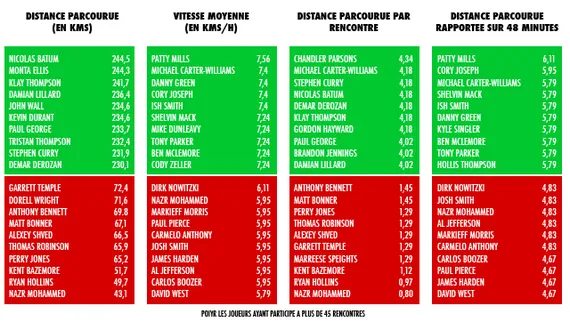 C'est néanmoins Chandler Parsons qui bouge le plus pendant les matches puisque l'ailier de Houston parcourt 4,34 kilomètres par rencontre. Evidemment, les arrières et les ailiers bougent beaucoup plus que les intérieurs et les pivots et on retrouve presque exclusivement des meneurs et des joueurs extérieurs parmi les joueurs qui couvrent le plus de distance pendant les rencontres.