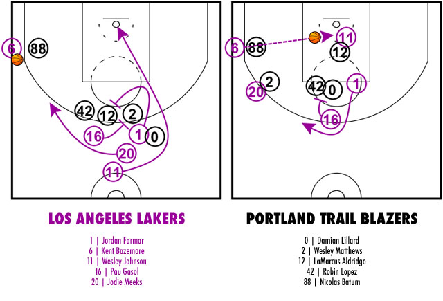 Kent Bazemore fait ainsi la remise en jeu tandis que Pau Gasol, Wesley Johnson, Jodie Meeks et Jordan Farmar se tiennent tous derrière la ligne à trois points. Pau Gasol pose un écran pour libérer Jodie Meeks et Jordan Farmar semble vouloir aller dans la raquette. Sauf que celui-ci s’arrête et pose un écran dans le dos de LaMarcus Aldridge, permettant alors à Wesley Johnson de prendre un temps d’avance.