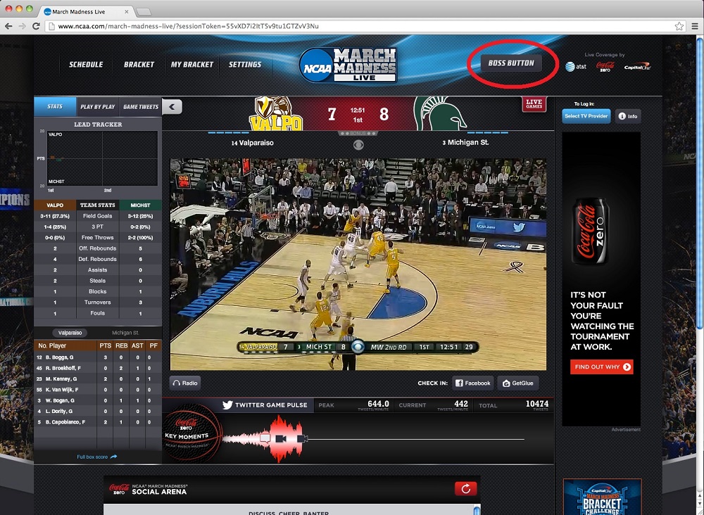 Le site NCAA.com permet de regarder tous les matchs en direct sur son PC ou son téléphone portable et un “Boss Button” a même été conçu afin de cacher en un clic cet écran pour ne pas risquer d’être surpris par une visite impromptue de son patron.