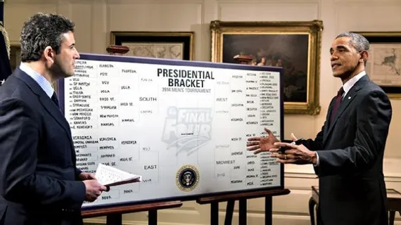 Comme chaque année, le président Barack Obama a rempli son bracket devant les caméras d'ESPN. Grand amateur de basket, aussi bien NBA que NCAA, Obama a pronostiqué la victoire de Michigan State face à Louisville en finale et mise sur une qualification de Florida et Arizona au Final Four. Parmi les “upsets” qu'il a choisi, on retrouve une victoire de Harvard, l'université de son ministre de l'éducation Arne Duncan (vu au Celebrity Game), face à Cincinnati, et de North Dakota State face à Oklahoma. En revanche, pas beaucoup d'originalité lors des tours suivants si l'on excepte les présences de North Carolina et Ohio State au Sweet 16.
