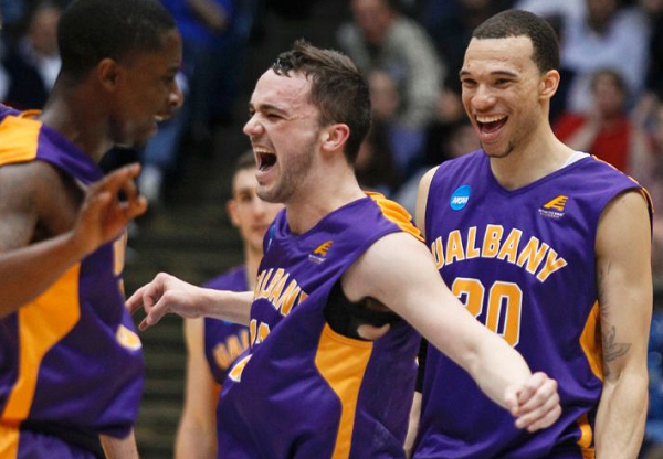 La première rencontre mettait aux prises le double champion de l’America East, Albany (18-14), à son homologue de la NEC, Mount St. Mary’s (16-16). Les Great Danes ont réalisé un début de match parfait face à une équipe visiblement crispée par l’enjeu et ont rapidement crée un écart substantiel de 13-0 (7e) puis 21-2 (10e). On pouvait alors penser que l’affaire était pliée et que les Mountaineers, vainqueurs surprises du tournoi de leur conférence, allaient perdre espoir et ne pourraient jamais refaire surface. Grave erreur… En effet, Will Miller a sonné le réveil des troupes pour Mount St. Mary’s avec un panier à 3-points rageur et les Mountaineers sont revenus à égalité au tableau d’affichage en à peine cinq petites minutes (23-23) sous le regard médusé de leurs adversaires. Après ce début de match de folie, les deux équipes ont plus ou moins fait jeu égal pendant le reste de la première période, et Albany a regagné les vestiaires avec quatre points d’avance (35-31, 20e).