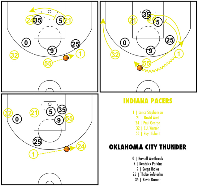 Cela isole un instant David West poste bas et Kevin Durant veille à ce que l’intérieur adverse n’ait pas l’accès du panier totalement ouvert. Il attend ainsi dans la raquette, le temps que Kendrick Perkins se défasse de l’écran de Paul George, histoire d’être sûr que David West ne soit pas seul sous le cercle.