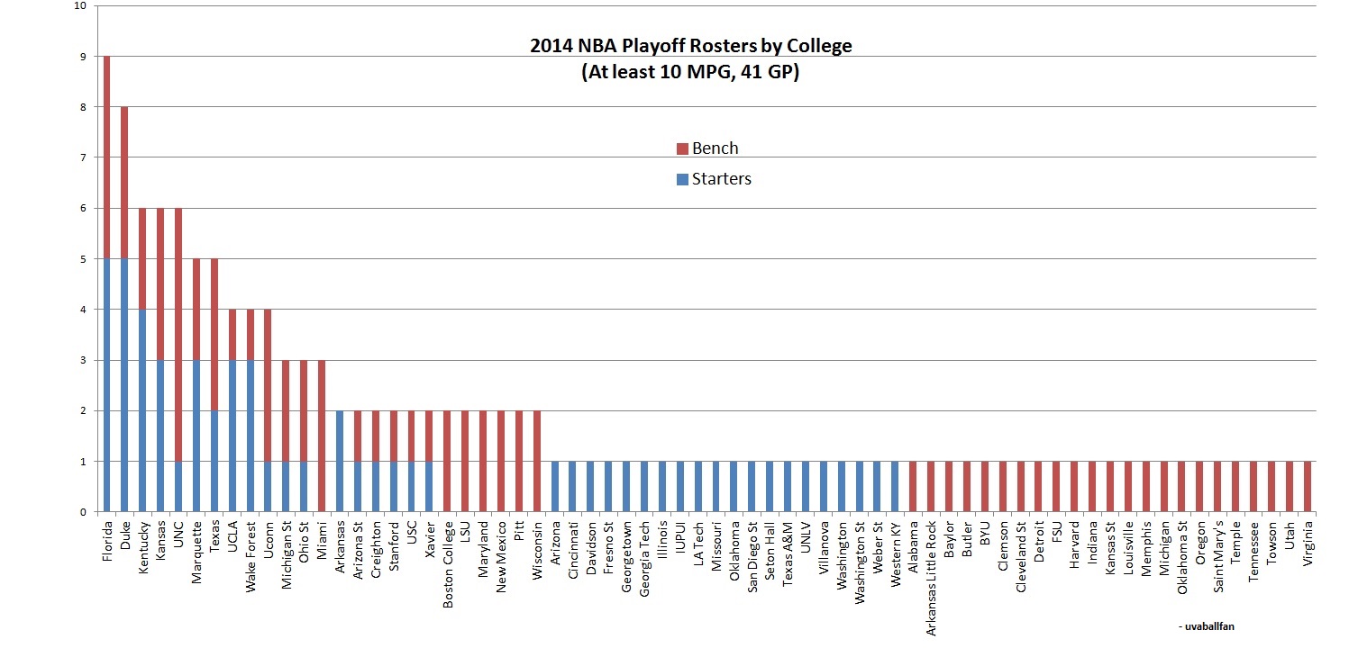 En deuxième position se trouve Duke avec huit joueurs, et suivent Kentucky, Kansas, et North Carolina avec six joueurs. Marquette et Texas sont en embuscade avec 5 joueurs. Outre Dwyane Wade, Jimmy Butler et Steve Novak, les Golden Eagles ont également formé le coach des Clippers Doc Rivers et Dwight Buycks, qui n’a pas suffisamment joué pour être inclus dans la liste. Il faut en effet avoir joué au moins 41 matchs et avoir eu un temps de jeu de plus de 10 minutes pour faire partie de ce graphique.