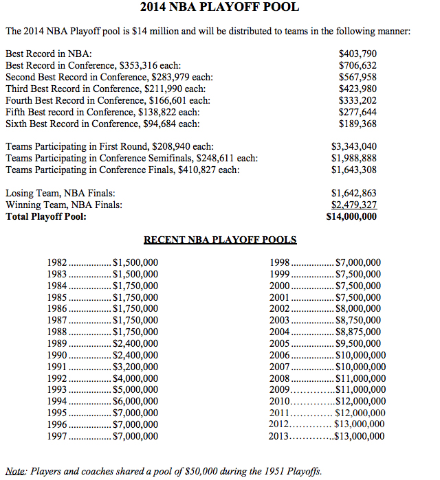Si San Antonio gagne le titre cette année, les Spurs toucheront donc 403 790 (meilleur bilan de la ligue) + 353 316 (meilleur bilan de la conférence Ouest) + 208 940 (premier tour des playoffs) + 248 611 (demi-finale de conférence) + 410 827 (finale de conférence) + 2 479 327 (victoire en finale) = 4 104 811 $.
