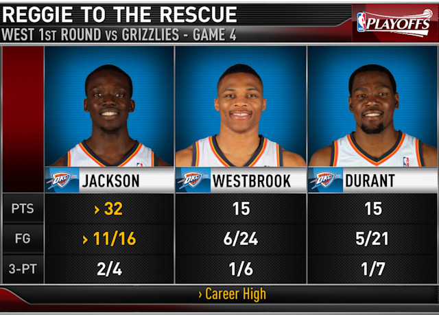 Troisième match de suite qui se termine après prolongation pour Memphis et OKC qui nous ont encore offert à match étouffant et passionnante. Cette fois-ci, c’est le Thunder qui en sort vainqueur (92-89), malgré le festival de maladresse de Kevin Durant (5/21 aux tirs) et de Russell Westbrook (6/24 aux tirs). Ce soir, le grand monsieur du match se nomme Reggie Jackson, enfin rentré dans sa série. Le 6e homme du Thunder réalise son meilleur match en playoffs avec 32 pts, et permet aux siens de reprendre l’avantage du terrain.