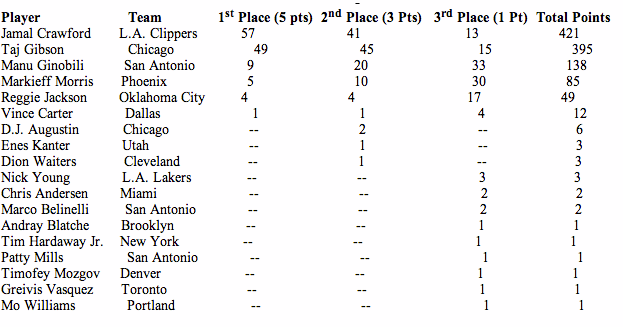 Manu Ginobili termine troisième (138 points) du tableau final, devant Markieff Morris (85 points) et Reggie Jackson (49 points). Une élection indécise donc, avec trois Spurs dans le classement.