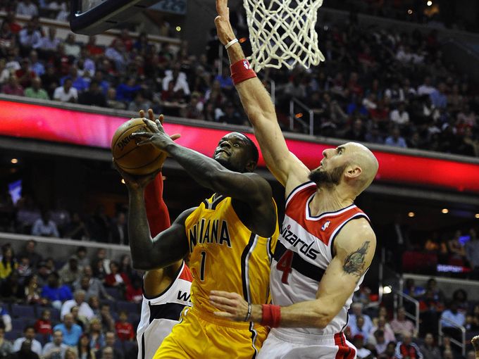 Dans une ambiance survoltée, John Wall ouvre pourtant le score pour les Wizards dès les premières secondes du match. Mais les Pacers sont bien dans le match et les deux équipes se tiennent dans un mouchoir de poche pendant la majeure partie du premier quart-temps. D’un côté comme de l’autre, l’envie et la motivation sont là mais cela induit parfois de la précipitation en attaque et des tirs forcés, ou balles perdues alors qu’il y avait sans doute mieux à faire. Le premier tournant du match arrive avec trois actions de toute beauté des Wizards : une superbe circulation de balle conclue par un dunk rageur de Marcin Gortat puis un contre de John Wall sur David West qui a mené à un paniers à 3-points de Trevor Ariza dans la foulée. Les hommes de Frank Vogel ont du répondant et le quart-temps se conclut sur le score de 17-17. John Wall égalise au buzzer et pour la huitième fois en huit matches, les Wizards ne sont pas menés après les douze premières minutes de jeu. Mais à 30% (Wizards) et 39% (Pacers), l’adresse n’est pas vraiment au rendez-vous.