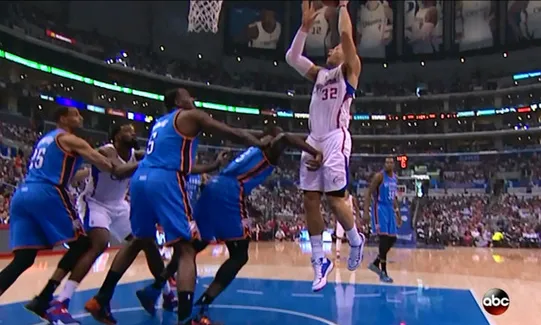 Moins d'une minute de jeu dans ce Game 4, et Blake Griffin est déjà au sol, se tenant l'entre-jambes. Grâce au ralenti, on comprend mieux sa douleur puisqu'il reçoit une droite de Serge Ibaka sous la ceinture. La douleur est telle que Doc Rivers prendra un temps-mort pour lui permettre de récupérer.