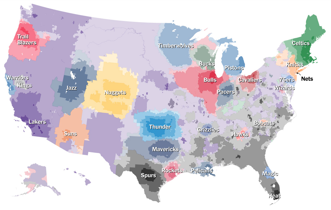 Comme il l’avait déjà fait pour le baseball, le New York Times vient de dessiner la carte des communautés des fans NBA aux Etats-Unis et au Canada. Comment ? Grâce aux “Likes” sur Facebook.