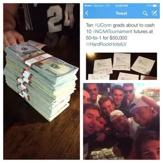 C'est la belle histoire de douze copains de promotion de l'université de Connecticut dont ils ont été diplômés au printemps 2013. Partis en vacances à Las Vegas au mois de novembre dernier, ils ont tous misé la somme de 100 dollars sur un titre des Huskies. A l'époque, Shabazz Napier et sa bande étaient attendus à la March Madness mais guère mieux. La cote de l'équipe était de 50 contre 1 au Hard Rock Hotel and Casino, l'hôtel où la bande se trouvait.