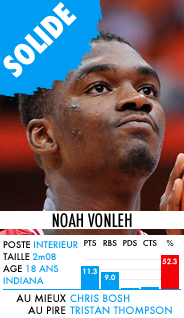 Star au lycée, Noah Vonleh est arrivé à Indiana avec pour mission de remplacer Cody Zeller dans la raquette des Hoosiers. Si les résultats de l’équipe ont été en dents de scie (non qualification pour la March Madness), Vonleh a de son côté rempli sa mission en devenant avec Yogi Ferrell le “go to guy” de l’équipe. Très efficace à l’intérieur, il a frôlé le double-double de moyenne et a prouvé qu’il était après Julius Randle le meilleur rebondeur de la promotion des freshmen. Les médias n’ont pas beaucoup parlé de lui pendant la saison, préférant se focaliser sur Jabari Parker, Andrew Wiggins ou Tyler Ennis, mais Vonleh a un potentiel tout aussi important que ses camarades de promo.