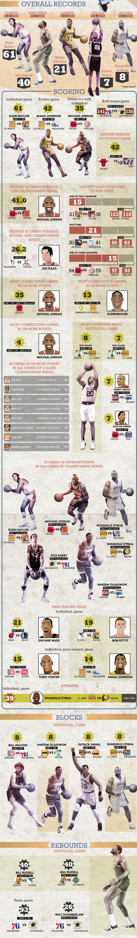 Certains records semblent inaccessibles, comme celui des 41 points de moyenne de Michael Jordan en 1993, les 40 rebonds de Bill Russell en 1960 et 62 ou encore les 39 lancers-francs tentés de Shaquille O’Neal en 2000.