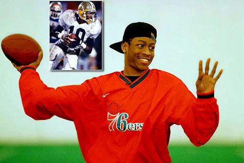 Allen Iverson joue occasionnellement au baseball, mais le sport qu’il kiffe par-dessus tout, c’est le football américain. Dans sa saison junior à la Bethel High School –le même que maman-, il crève l’écran comme quarterback (1 423 yards et 14 touchdowns à la passe ; 781 yards et 15 touchdowns à la course). Son équipe remporte le championnat de l’État de Virginie en 1992.