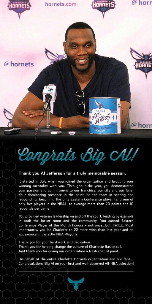 Al Jefferson a transformé l’équipe de Charlotte la saison passée, au point d’être considéré comme le eilleur free agent signé par la franchise depuis sa création il y a dix ans. Afin de le remercier pour son excellent travail, et sa place dans la Third All-NBA Team, Michael Jordan n’a pas hésité à acheter une pleine page du Charlotte Observer de dimanche afin d’honorer son pivot vedette. Arrivé chez les Bobcats l’été dernier, Jefferson a rapidement trouvé ses marques et a été le seul joueur de la Conférence Est à tourner à 20 points et 10 rebonds cette saison (21,8 points, 10,8 rebonds). Il a également été élu au sein de la All-NBA Third Team et meilleur joueur des mois de mars et d’avril.
