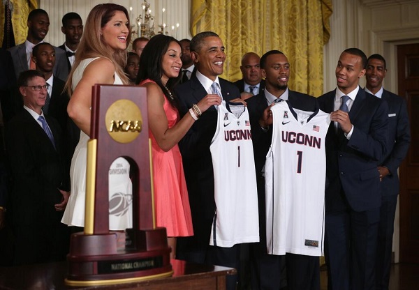 Les équipes masculines et féminines d’UConn, toutes deux championnes NCAA 2014, ont rendu visite à Barack Obama à la Maison Blanche ce lundi. Comme le veut la tradition, les coachs des deux équipes, Kevin Ollie et Geno Auriemma, ont offert un maillot au président des Etats-Unis.