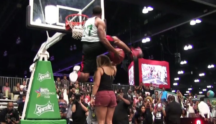 Absent du concours de dunks du Quai 54, Young Hollywood participait ce week-end au concours organisé avant les BET Awards. Sous les yeux d’un jury composé notamment de Cedric Ceballos et Terrence Ross, il a passé un Rider par-dessus une jeune fille debout sur une chaise !