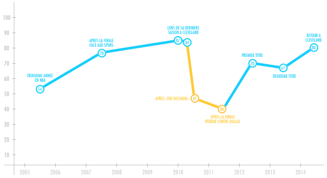 Après être monté à 87 en janvier 2010, lors de sa dernière année à Cleveland (le score, sur 100, mêlant la connaissance des personnes interrogées sur l'intéressé et leur avis positif/négatif sur celui-ci), LeBron James était tombé à 47 après “The Decision” et 40 après la finale perdue face à Dallas.