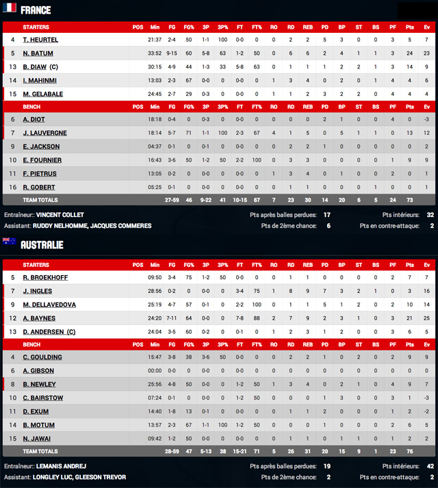 Mais les Australiens remettent un coup de collier. Aron Baynes et Boris Diaw se rendent coup pour coup mais le pivot prend finalement le dessus. Avec 21 points et 9 rebonds, il permet à l’Australie de repasser devant. Criblé de fautes en première mi-temps, le Spur s’est ajusté et c’est lui qui instigue le retour des jaunes et verts. Nicolas Batum a beau continuer son festival avec ses 25 unités au compteur, nouveau record en sélection, les Bleus n’arrivent pas à contenir les Australiens. Matthew Dellavedova (10 points) pousse l’écart à 4 longueurs à un peu plus d’une minute de la fin et la France ne reviendra plus malgré un ultime tir primé de Batum (76-74).