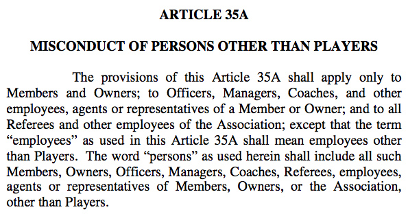 “Tout joueur qui, directement ou indirectement, attire, persuade ou convainc (ou tente d’attirer, de persuader ou de convaincre) un joueur, un coach, un entraîneur, un GM ou toute autre personne sous contrat avec une autre franchise de négocier ses services ou de passer un accord pour ses services, sera accusé de “tampering”. Le commissioner aura le droit de décider si ces charges sont maintenues. Si les charges sont maintenues, le commissioner peut suspendre un joueur pour une période définie ou non, lui imposer une amende ne dépassant pas 50 000 dollars, voire lui infliger à la fois une suspension et une amende”.