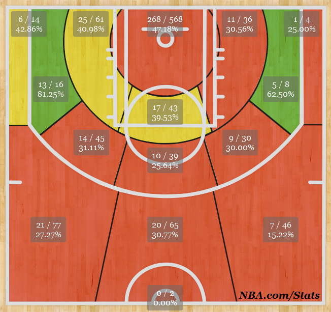 Opéré de l’épaule en mai dernier, Carter-Williams devrait pouvoir revenir en septembre donc pour le training camp. En attendant, le meneur peut profiter de son apprentissage au shoot, lui qui était plutôt maladroit pour sa première saison dans la ligue. A l’exception des côtés gauche et droite de la raquette, à 5-6 mètres, où il était particulièrement adroit.