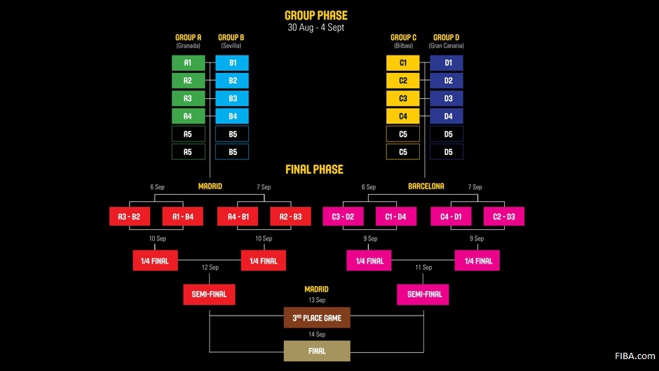 Pour ce qui est des matchs couperets (à partir des huitièmes de finales), les ressortissants des groupes A et B se retrouveront à Madrid alors que les groupes C et D verront leurs meilleurs éléments de disputer quarts et demi à Barcelone. Le tournoi se clôturera avec la grande finale (pour la médaille d’or) et la petite finale (pour la médaille de bronze) qui auront toutes deux lieu à Madrid, dans la salle du Real, la “maison magique” qui peut accueillir pas moins de 13 700 spectateurs.