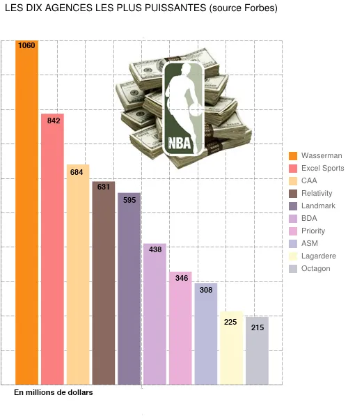 En NBA, le salaire moyen est de 5,7 millions de dollars, une belle somme qui, pour une petite partie, est destinée aux agents. Sur le marché américain, leurs commissions sont aussi réglementées et émargent entre 2 et 4% (du montant des contrats sportifs). Dans d'autres pays, tels que la France, cette commission peut grimper jusqu'à 7, voire 10%.