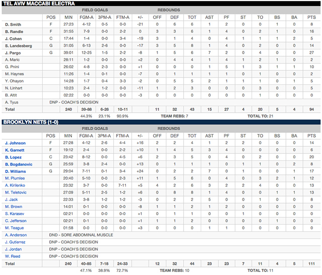 Après des mois d’absence, on attendait de voir Brook Lopez et le pivot de Brooklyn n’a pas déçu. Face au Maccabi Tel Aviv de Jeremy Pargo (27 points, 6 rebonds, 7 passes), le pivot a imposé sa présence dans la peinture, rappelant ses mouvements poste bas pour porter les siens vers la victoire.