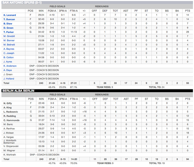Ce sont les Français qui se montrent les plus entreprenants en début de partie. Incisifs, Tony Parker et Boris Diaw vont au cercle et concluent, sans oublier de fixer pour leurs coéquipiers. Après cinq minutes de jeu, les Spurs mènent 18 à 6. Après la sortie des cadres, les remplaçants texans finissent par commettre une succession d’erreurs jusqu’à la fin du quatrième quart-temps : Bryce Cotton est pressé, Jeff Ayres manque un lay-up près du cercle et Manu Ginobili attend, en vain, des nouvelles de l’arbitre. Les Berlinois en profitent, menés par les opportunistes Niels Cliffey et Alex King.
