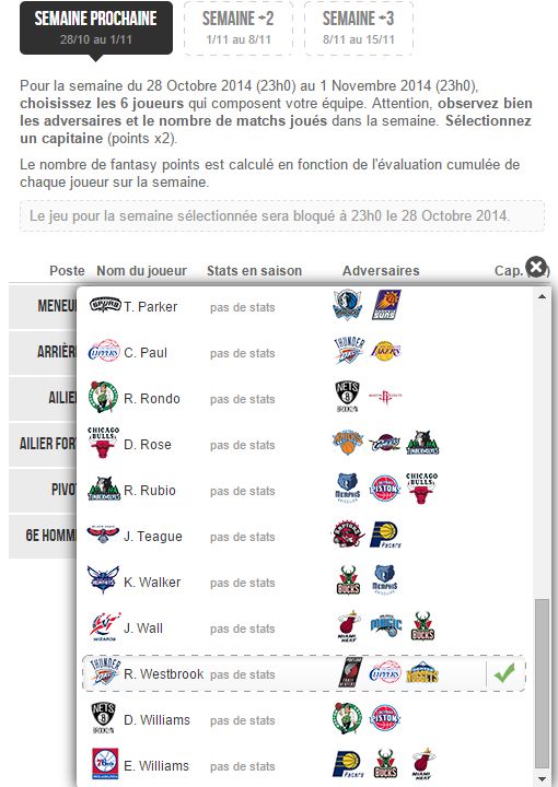 Exceptionnellement, pour la reprise de la saison régulière, le jeu se déroule de mardi à dimanche. C’est-à-dire que sont pris en compte les matches du mardi soir (28 octobre) au samedi soir (1er novembre). Le dimanche, on remet les compteurs à zéro pour la semaine suivante, et rebelote, vous sélectionnez un nouveau cinq majeur et un 6e homme.