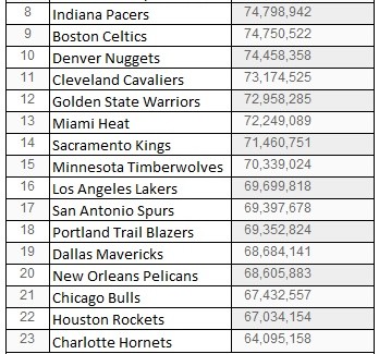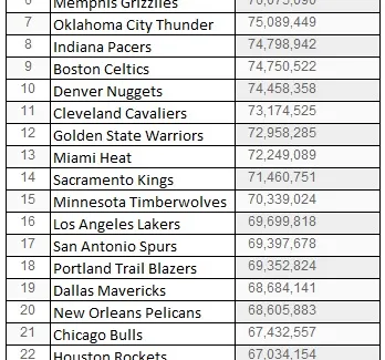 Suivent les Wizards, avec 76,3 millions, soit seulement 500 000 dollars de moins que la luxury tax (76,8 millions cette année). Les Raptors sont 5e avec 76,1 millions. Malgré un effectif en pleine reconstruction, les Celtics sont 9e avec 74,8 millions. Les Cavaliers et leur nouveau “Big Three” pointent en 11e position avec 73,1 millions, deux places devant le Heat (72,3 millions).