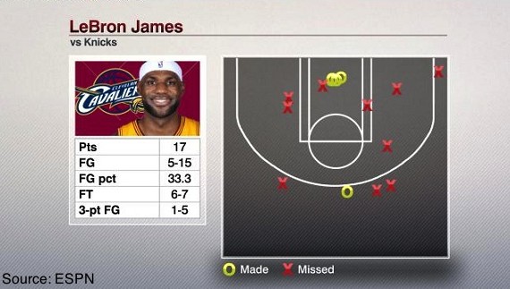 Incapable de trouver son shoot en première mi-temps, avec un faiblard 1/9 à la pause, LeBron a même semblé à côté de ses pompes quand il a balancé une passe pour Kyrie Irving qui a finalement atterri à côté de Spike Lee dans les gradins. Des erreurs inhabituelles pour le King…