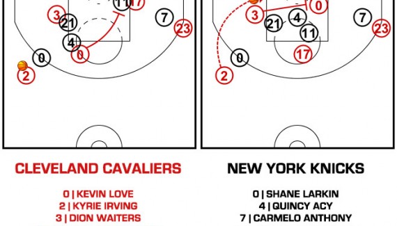 Les Knicks ayant décidé de ne pas changer sur les écrans, celui de Dion Waiters est donc fait un peu dans le vent, Quincy Acy étant obligé de rester au milieu des nombreux joueurs qui bougent dans la raquette. Gêné par Dion Waiters et Iman Shumpert qui le suit, le Knick est un peu loin de Kevin Love et, surtout, dos au ballon. Il ne voit donc pas la passe dans le timing de Kyrie Irving et se retrouve obligé de tenter une interception désespérée pour faire capoter l’action. Mais c’est trop tard et l’intérieur des Cavaliers peut tranquillement mettre le ballon dans le cercle.
