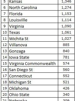 Arizona prend la 2e place avec 5 votes plaçant les Wildcats au sommet de la hiérarchie. Wisconsin, qui a conservé l’ossature de son équipe demi-finaliste l’an passé, complète le podium. Duke, et son extraordinaire promotion de freshmen, se classe 4e devant les poids-lourds habituels du ranking que sont Kansas, North Carolina, Florida et Louisville. Virginia et Texas sont eux aussi dans le Top 10, à la 9e et 10e place respectivement. Les Cavaliers sont d’ailleurs présents dans le Top 10 pour la première fois depuis 1982, époque où Ralph Sampson terrorisait les raquettes de la NCAA.