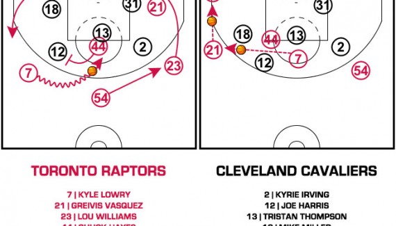 Après avoir profité de l’écran de son coéquipier, Kyle Lowry se retrouve face à Tristan Thompson, chargé de le gêner en attendant que Joe Harris revienne sur le joueur. Mais le meneur sert alors Greivis Vasquez, venu se placer sur l’aile, ce qui force le défenseur bas gauche (Mike Miller) à sortir sur lui. Le Vénézuélien n’est toutefois qu’un relais et il transmet directement à Lou Williams, venu se placer dans le corner. Shawn Marion sent alors le décalage créé et il tente de sortir pour venir gêner le sixième homme des Raptors. Sauf qu’il doit partir du côté droit et qu’il est donc logiquement court.