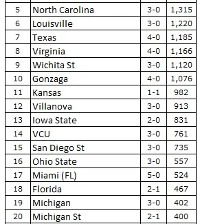 Ont également reçu des votes : Oklahoma 109, Stanford 80, Providence 63, Utah 38, Minnesota 21, Northern Iowa 17, Rhode Island 16, Syracuse 15, Oklahoma St 14, Memphis 10, Georgetown 10, Baylor 7, Indiana 6, California 5, Nebraska 5, Illinois 5, Cincinnati 4, NC State 4, Wyoming 4, UTEP 3, Maryland 3, Dayton 3, BYU 2, Northeastern 1, Xavier 1.
