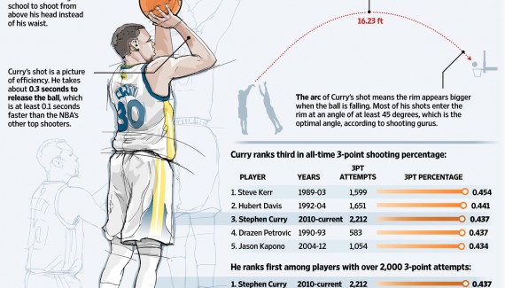 Au niveau de la courbe du tir, Curry est le shooteur qui atteint la hauteur la plus élevée. En moyenne, sur ses tirs à 3-points, le ballon culmine à 5m45, soit plus de 2m40 au-dessus du cercle. Cette trajectoire permet ainsi au ballon de redescendre vers le cercle avec un angle de 45°. Selon des spécialistes, cités par le journal, c’est la courbe parfaite.