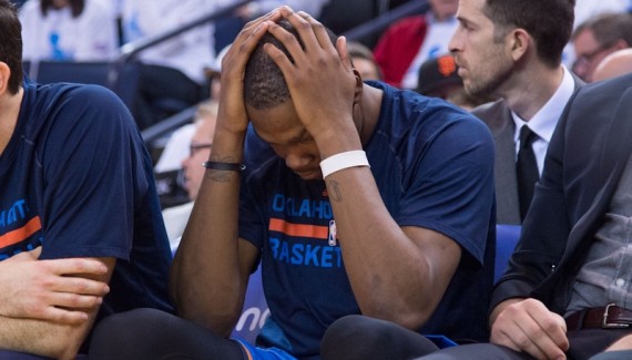 Durant fait la moue sur le banc mais avec son 3/16, le meilleur joueur de la semaine passée a pris un véritable mur et n’a jamais trouvé son rythme ; tout comme son compère Westbrook a été encore plus loin avec un 5/21 au shoot et des dribbles à répétition. Les deux superstars combinent 21.6 % de réussite, leur deuxième pire pourcentage ensemble ! La sanction est donc logique avec une défaite de 26 points (117-91).