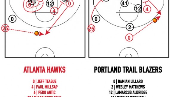 Ces derniers temps, on a également vu un système de double écran assez intéressant afin de libérer Kyle Korver, de plus en plus surveillé par les défenses. Après un temps mort, le shooteur profite généralement d’un écran de son intérieur (Pero Antic ou Paul Millsap face à Portland et Utah) pour se placer tout près du corner. Thabo Sefolosha, qui vient de faire la remise en jeu, se présente ensuite comme s’il voulait poser un écran pour une course qui remonte.