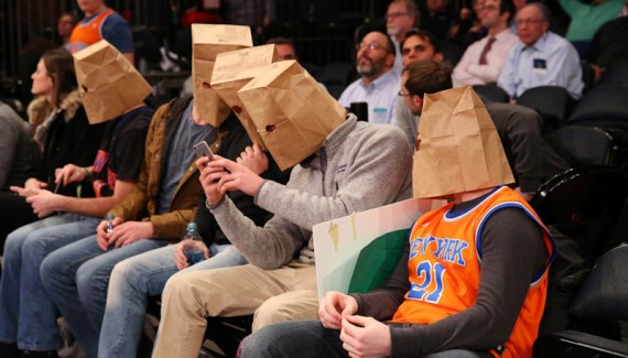 Jeunes ou moins jeunes côté Knicks, à la fin du quart-temps, les Rockets mènent de 24 points, et Kevin McHale en a assez vu. Il rappelle ses titulaires, et laisse son banc terminer la rencontre. Au final, on retrouve les 24 points d’écart (120-96), et les Knicks subissent une 11e défaite de suite à domicile. Certains spectateurs du premier rang n’en peuvent plus, et ils ont honte de leur équipe. Ils ont ainsi manifesté leur mécontentement en portant des sacs en papier sur la tête…