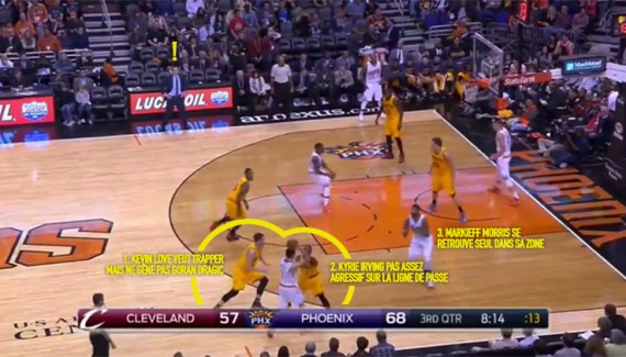 Pour protéger son intérieur, David Blatt a ensuite tenté de le faire défendre sur Alex Len avant de mettre en place une zone 2-1-2. Le coach a néanmoins rapidement mis fin à l’expérience car les Cavaliers ne savaient simplement pas l’appliquer. Chargé du poste haut, Kevin Love tient ses bras au niveau du torse d’Alex Len, lui permettant de faire une passe plus que facile pour Markieff Morris, qui avait pris la position poste bas.