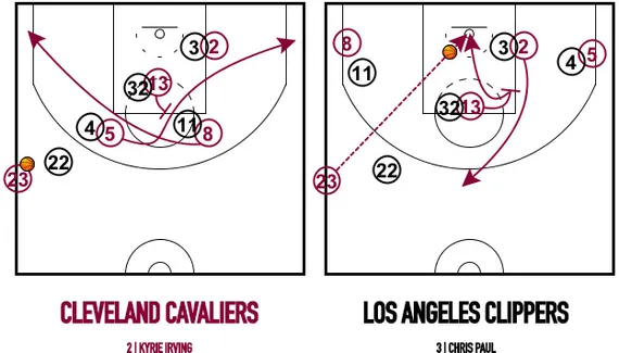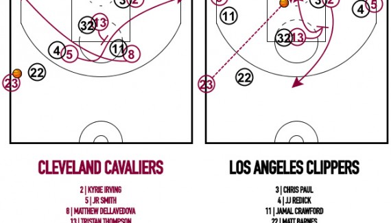 Tristan Thompson pose ainsi un premier écran pour Matthew Dellavedova, puis un autre pour JR Smith. Les deux arrières croisent leurs courses respectives pour se placer dans le corner. Aussitôt, Tristan Thompson vient poser un nouvel écran pour Kyrie Irving, qui remonte vers la ligne à trois points.