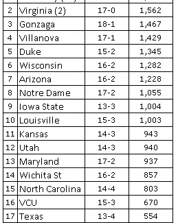 Toujours invaincus cette saison en NCAA, Kentucky et Virginia conservent les deux premières places du ranking cette semaine. Les Wildcats ont été placés en tête par 63 votants sur 65 et ont repris leur marche en avant avec deux très larges victoires face à Mizzou et Alabama. Les Cavaliers ont de leur côté dominé Clemson et Boston College, deux équipes du bas de tableau de l'ACC. Gonzaga reste 3e malgré un difficile succès à Pepperdine, Villanova gagne une place et se classe 4e, au détriment de Duke, 5e, battu par Miami avant de remporter un succès de prestige à Louisville. Kansas, battu à Iowa State, et Utah, qui s'est incliné face à Arizona quittent le Top 10. Wisconsin, Arizona, Notre Dame, Iowa State, et Louisville se classent de la 6e à la 10e place.