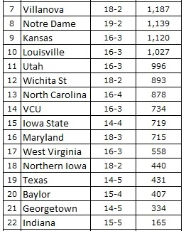 Ont également reçu des votes : Colorado St 57, Arkansas 54, Ohio State 43, SMU 43, Providence 29, Dayton 28, Georgia 28, Stanford 16, Wyoming 14, Seton Hall 10, LSU 10, San Diego St 4, Tulsa 2, Texas A&M 2, Davidson 1, Saint Mary's 1, Stephen F. Austin 1, Green Bay 1.