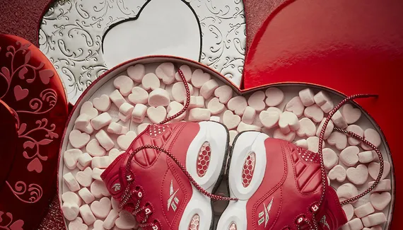 Le premier modèle d'Allen Iverson s'habille donc de rouge, de coeurs et d'une toebox argentée. Ce modèle est destiné aux femmes. Il pourra donc être le moyen de faire une blague cruelle à madame en posant le genou au sol avant de lui lancer, “J'ai une question pour toi”, puis de lui tendre la boîte.