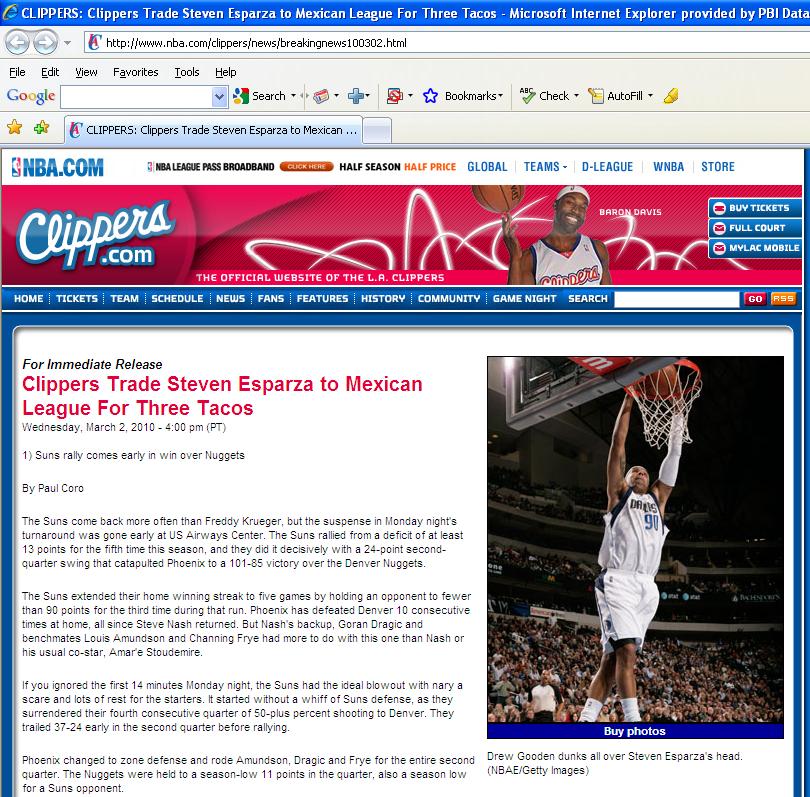 La nouvelle reprend un résumé du match entre les Suns et les Nuggets qu’elle agrémente d’une photo de Drew Gooden. Particulièrement savoureuse, la légende note que “Gooden dunke sur la tête de Steven Esparza” alors que l’intérieur est seul… Visiblement, il s’agit d’une blague interne puisque le dénommé Steven Esparza est assistant au service communication du club. Toujours présent hier sur le site du club, l’article a depuis été effacé.