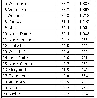 Ont également reçu des votes : Texas 70, San Diego St 64, Providence 44, Murray St 38, Temple 28, Georgetown 23, Michigan St 17, Dayton 10, Texas A&M 8, Valparaiso 8, Indiana 7