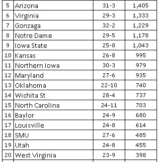 Ont également reçu des votes : Oregon 91, Providence 62, Xavier 18, Davidson 16, Ohio State 12, Stephen F. Austin 12, Wyoming 6, Boise State 5, LSU 5, BYU 3, Valparaiso 3, Wofford 2, Harvard 2, Murray St 2, Dayton 1, Iowa 1, Purdue 1, Colorado St 1.